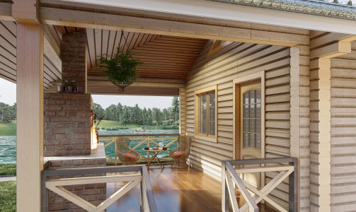 Банный комплекс из профилированного бруса камерной сушки с планировкой, уже ставшей традиционной (комната отдыха, парная и мойка). Вход выполнен через просторную открытую террасу. Благодаря достаточно большим габаритам, в бане с легкостью разместится компания из 5-6 человек.
